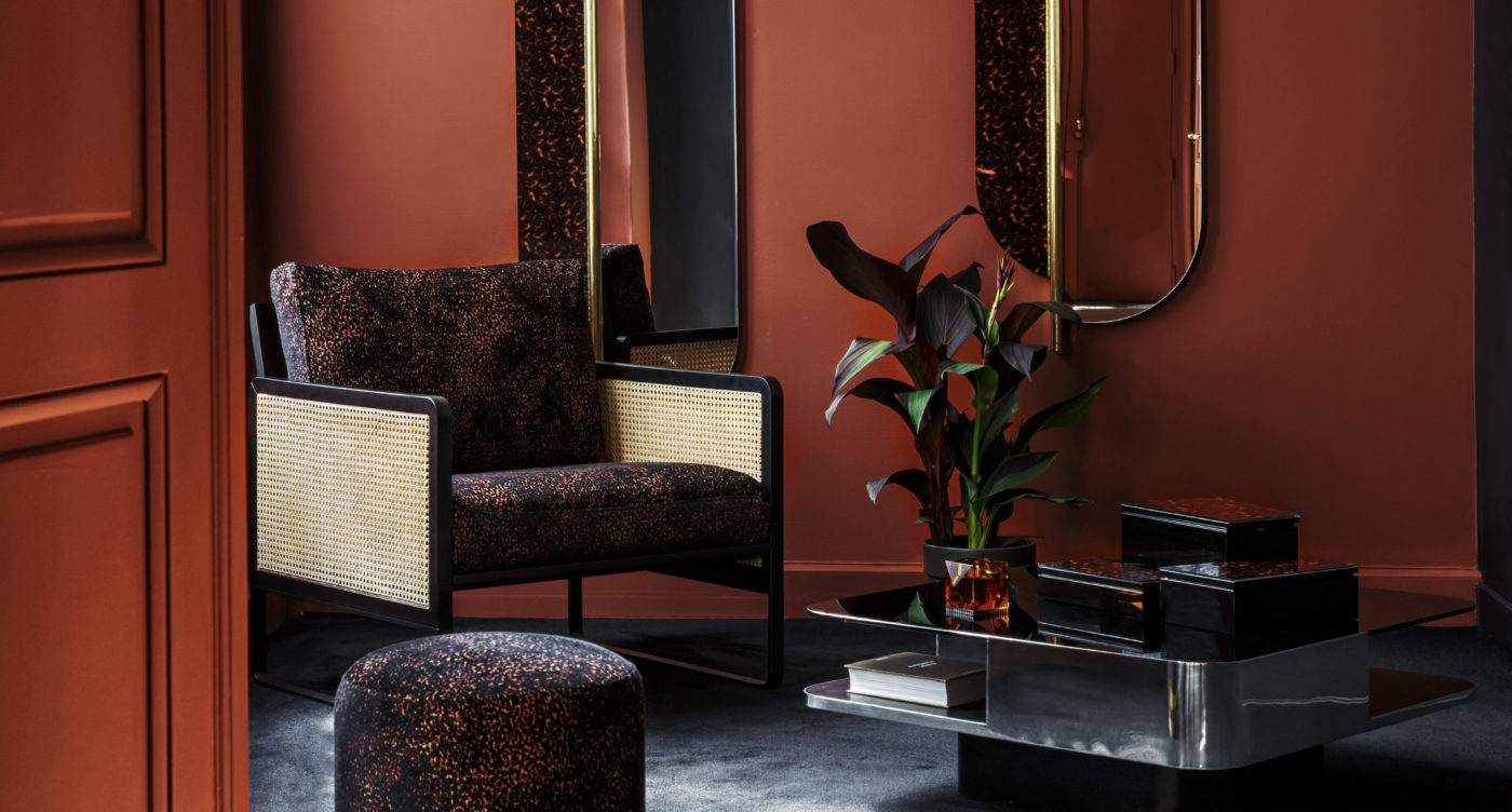 The sculptural Totem mirror and the Pigalle boxes by Red Edition are bedecked in a warm tortoiseshell pattern that evokes the heyday of the 1970s.