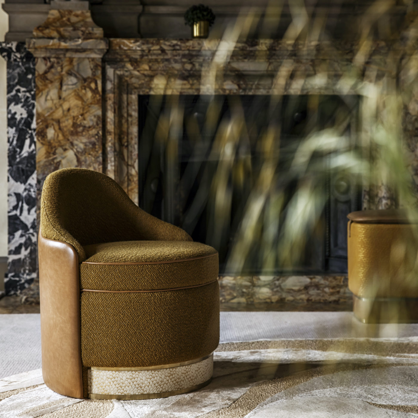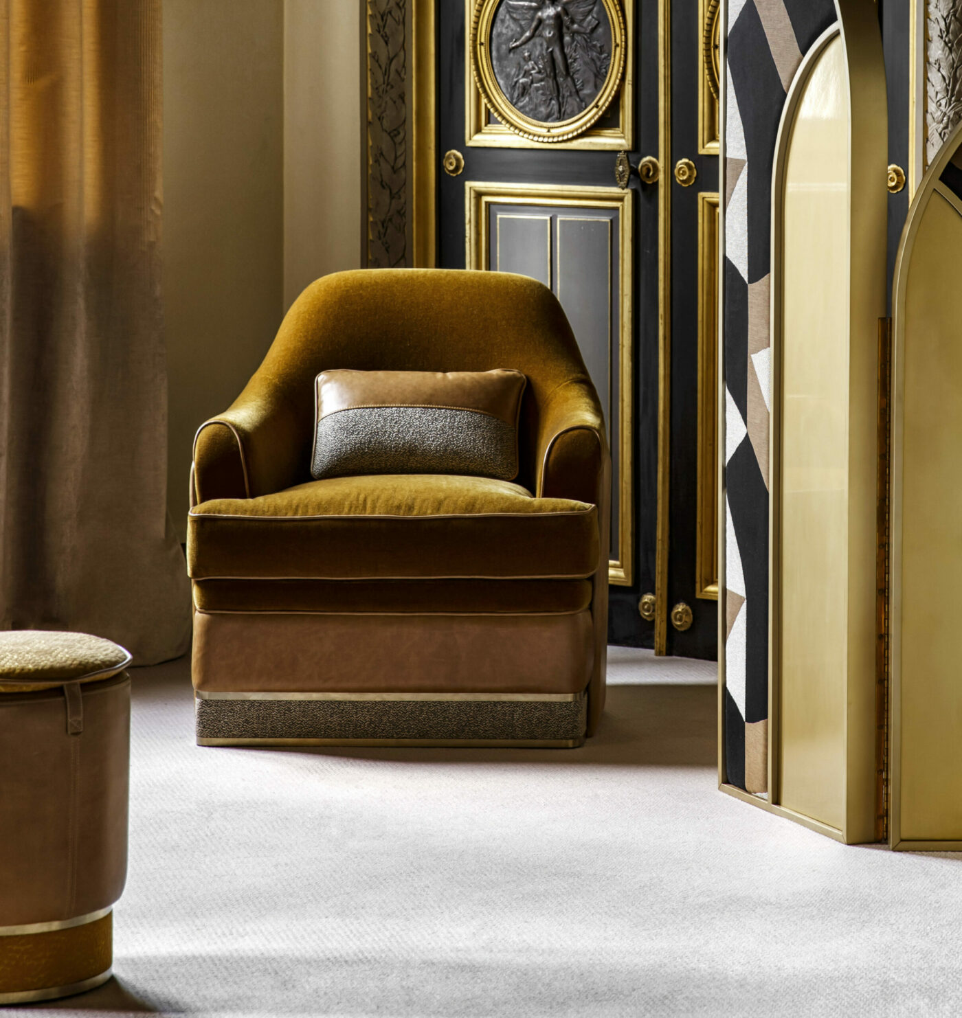 The sophistication of this collection lies in a subtle interplay of combinations and generous, harmonious overlays of refined materials: matts and glosses converse. Deep lacquerware, decorative brass trim, eggshell degrade, encased leather, sensual mohair velvet, subtle Jacquard, warm bouclette, structured semi-plain fabrics, delicate patterns and geometric weaves harmonise and enhance one another without antagonism.