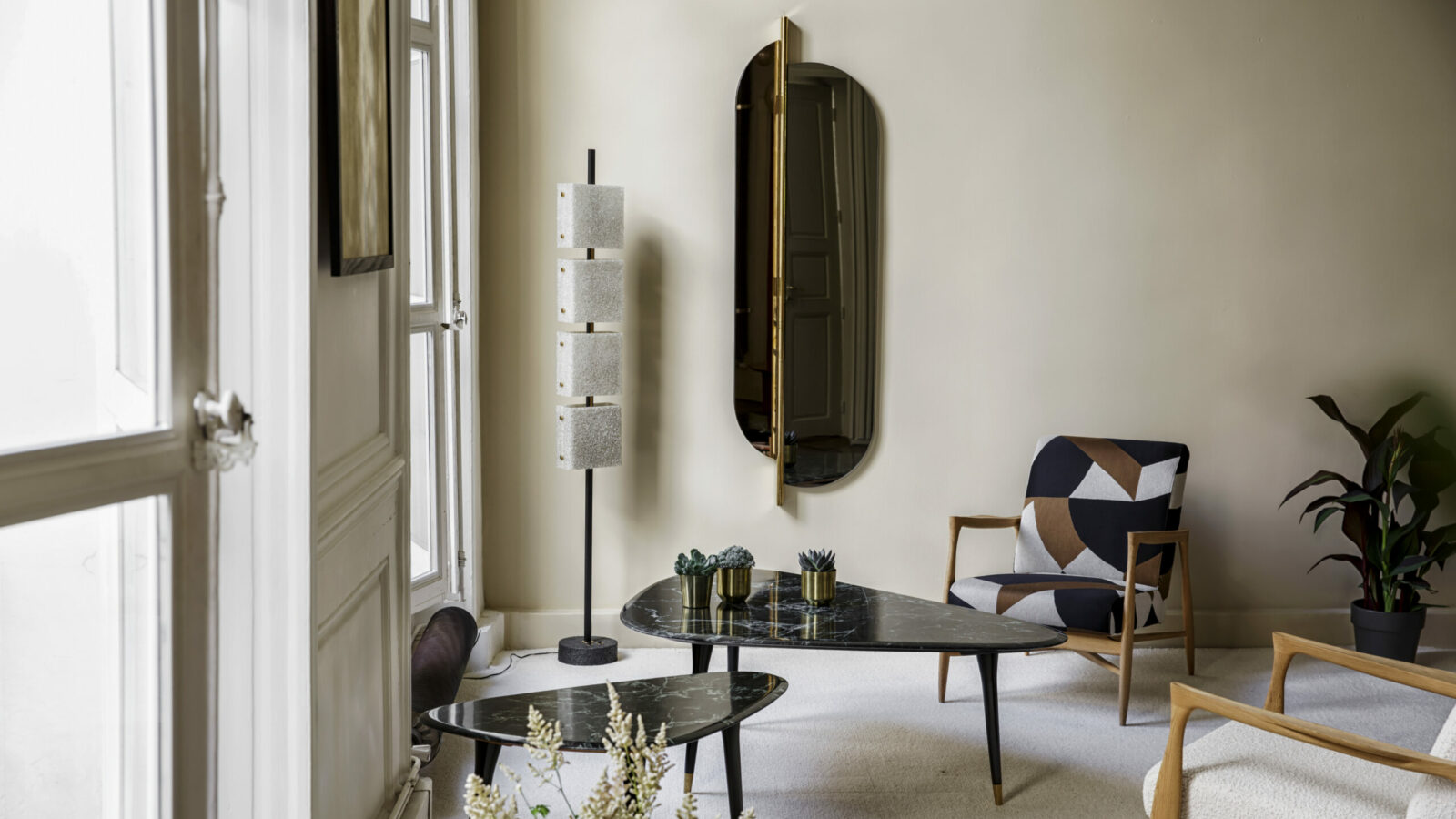 The Totem Mirror doubles as a sculpture, evoking both decorative arts and the 70s in your decor. Its uniqueness lies in its swiveling panel, offering the freedom to choose the desired angle and opening. With its flexibility, size, and design, the Totem Mirror boldly makes its mark in your interiors.