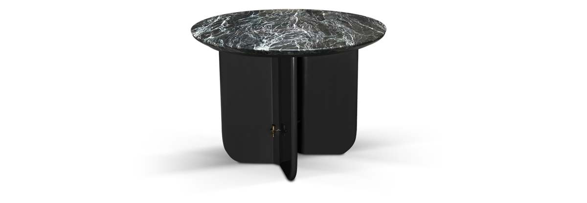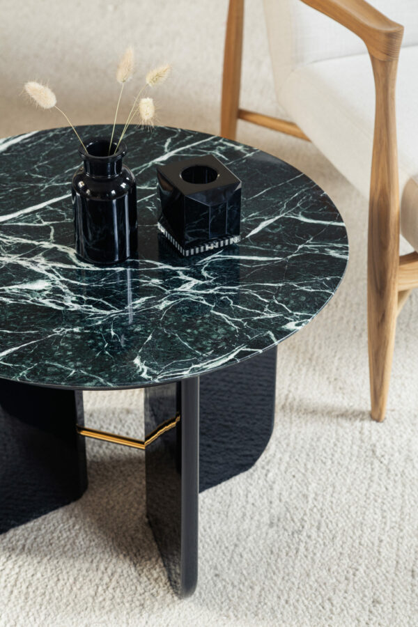 Plateaux : bois laqué, marbre vert ou écailles laquées.